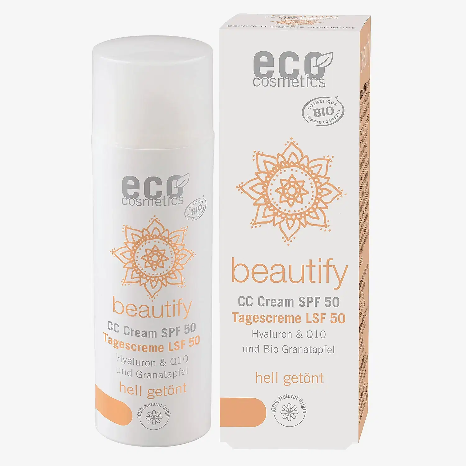Die ECO beautify CC Creme hell getönt ist eine pflegende Tagescreme mit LSF 50. Complete Care für jeden Hauttyp. Die natürliche Tönung passt sich hellen (warmen oder kühlen) Hauttönen an und verleiht ein ebenmäßiges, leicht mattiertes Finish. Hyaluronsäure und Q10 mildern Fältchen, spenden Feuchtigkeit und sorgen für Elastizität und Spannkraft. Bio Granatapfel und Bio Traubenkernextrakt kräftigen und schützen die Haut vor Umwelteinflüssen. Das OPC (Oligomere Proanthocyanidine) aus Bio Traubenkernextrakt ist bekannt als einer der stärksten, pflanzlichen Antioxidantien. Bio Sheabutter, Bio Jojobaöl und Bio Granatapfelkernöl versorgen die Haut mit essentiellen Nährstoffen. Für einen natürlichen, ebenmäßigen Look. Eine natürliche Duftkomposition verleiht einen angenehmen Duft.