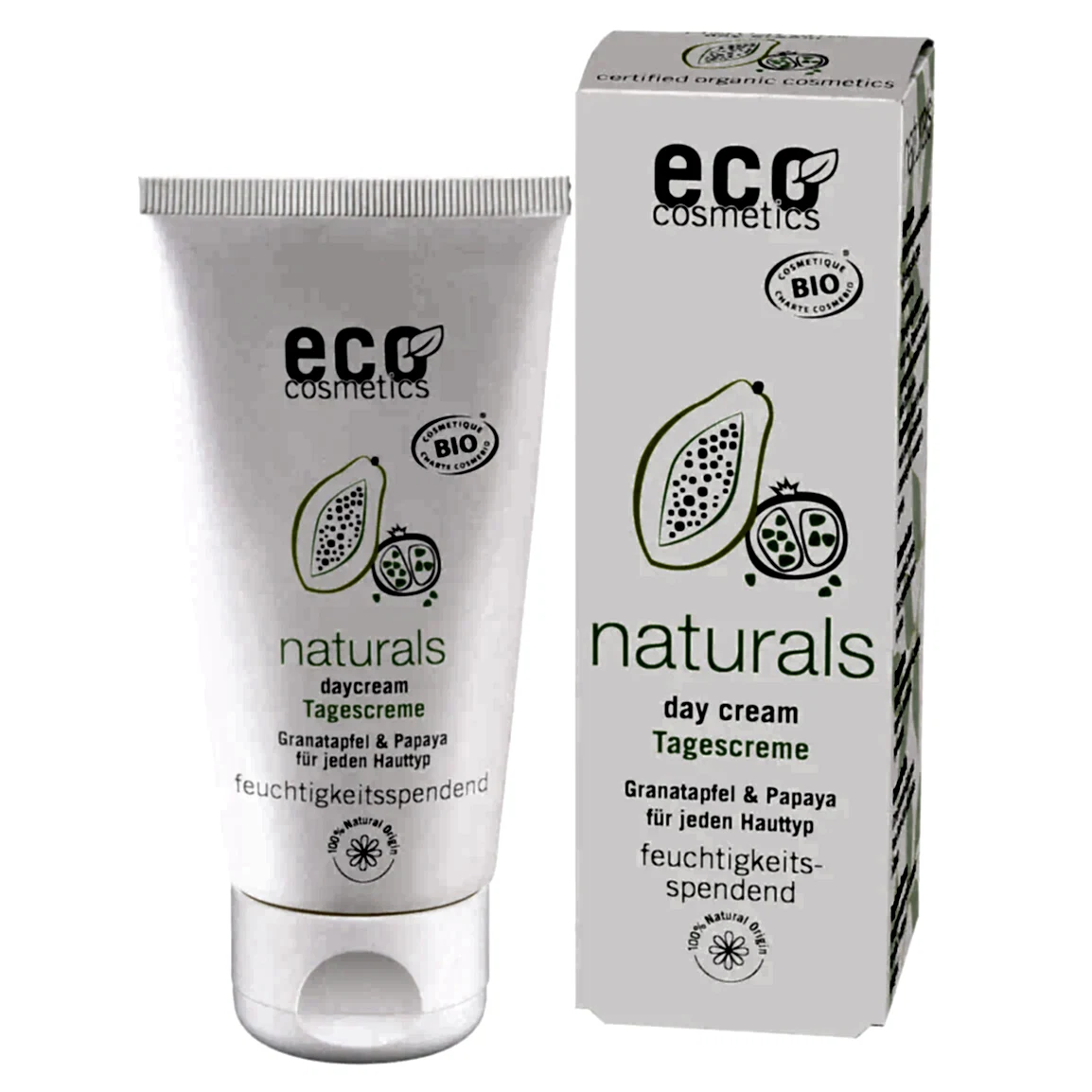 Die ECO Tagescreme ist eine leichte Feuchtigkeitspflege für jeden Hauttyp. Bio Granatapfel-Extrakt und Bio Granatapfelkernöl pflegen die Haut glatt und schmeidig. Papaya-Extrakt trägt aufgrund seiner klärenden und feuchtigkeitsspendenden Eigenschaften zu einem besseren Hautbild bei. Bio Weinblatt-Extrakt und Bio Olivenblatt-Extrakt sind antioxidativ und pflegend. Bio Traubenkernöl und Bio Sheabutter spenden der Haut essentielle Nährstoffe. Die Haut wirkt glatter und ebenmäßiger. Auch kleine Trockenheitsfältchen werden gemildert. Mit ihrer leichten Textur eignet sie sich auch als Basispflege unter dem Make-Up. Eine Komposition natürlicher, ätherischer Öle verleiht der ECO Tagescreme ihren dezenten, leicht frischen Duft.