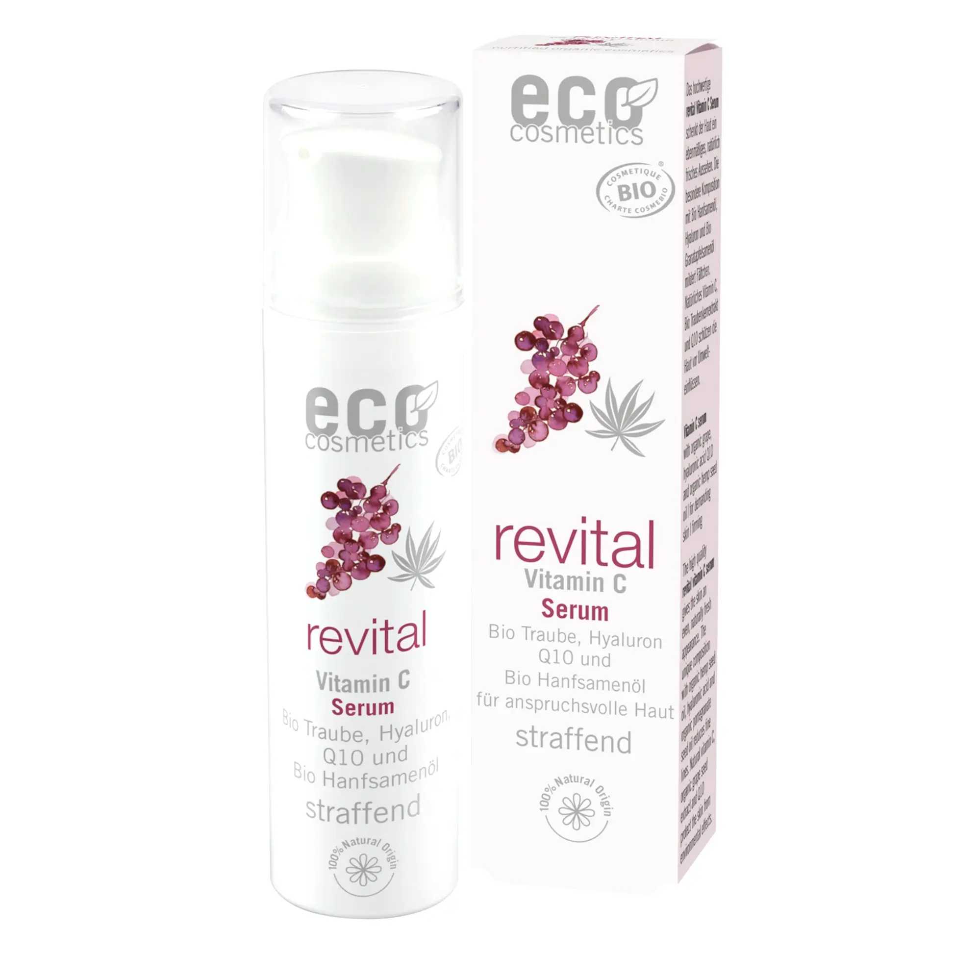 Das ECO revital Vitamin C Serum mit natürlichem Vitamin C, Bio Traubenkernextrakt, Hyaluronsäure, Q10 und Bio Hanfsamenöl ist der perfekte Partner für trockene und anspruchsvolle Haut. Es spendet intensiv Feuchtigkeit, mildert Fältchen, strafft und glättet Konturen. Schenkt der Haut ein ebenmäßiges, natürlich-frisches Aussehen. Die Kombination aus natürlichem Vitamin C, Vitamin E und Bio Traubenkernextrakt schützt die Haut dank ihrer antioxidativen Eigenschaften vor freien Radikalen und hemmt Oxidationsprozesse. Vitamin C regt die Kollagenbildung an und ist bekannt dafür Altersflecken zu reduzieren. Bio Hanfsamenöl fördert die Regeneration der Haut. Hyaluronsäure und Q10 sorgen für Elastizität und Spannkraft. Das revital Vitamin C Serum kann alleine oder unter der gewohnten Tages- und Nachtpflege sowie unter dem Make-Up verwendet werden. Eine Komposition natürlicher, ätherischer Öle verleiht dem ECO revital Vitamin C Serum einen einzigartigen, angenehmen Duft.